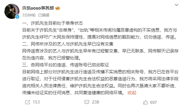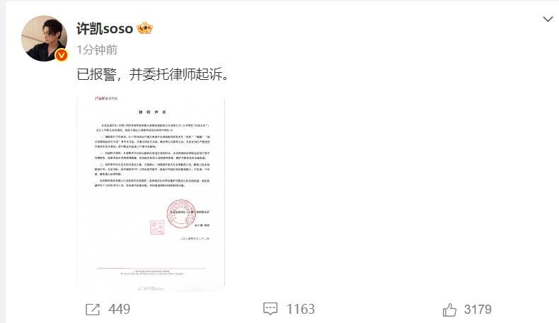 目前网络上部分对许凯先生进行造谣及传播不实消息的相关账号,我方已在各平台进行取证,对于任何侵害许凯先生合法权益的恶意造谣行为,我方将采用法律手段追究相关人员法律责任,维护许凯先生合法权益。同时也再次恳请大家不要听信、传播未经证实的任何消息,共同营造健康的网络环境。
