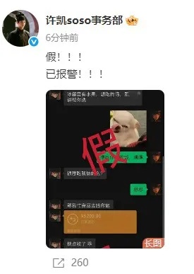 8月22日,许凯工作室打假网传聊天记录,称:“假!!!已报警!!! ”