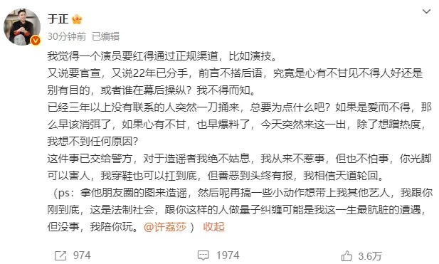 许凯老板于正也在社媒评论区,回应许凯恋情话题,称许凯目前单身,其与网传造谣涉及艺人在21年拍戏时有过短暂交集,早已无联系,聊天记录均为伪造,已报警。