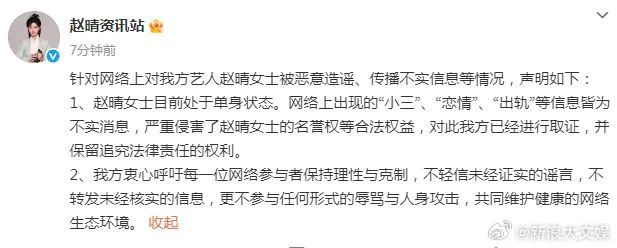8月22日,艺人赵晴方发文辟谣,称赵晴目前单身,否认“小三”“恋情”“出轨”传闻:
