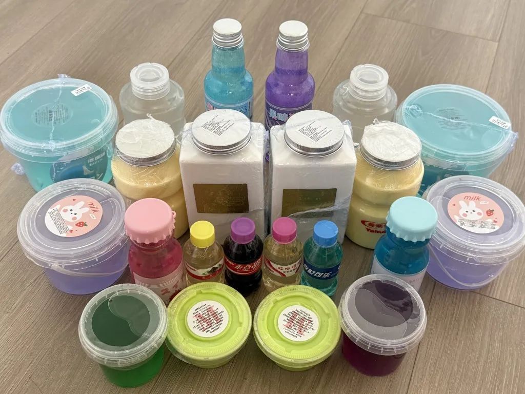 “珍珠奶茶”的“假水”会做成巧克力色,并添加类似珍珠的小圆颗粒;“幻彩琉璃”则会做成色泽光亮的粉色并添加闪粉。更有甚者,会将“假水”做成小瓶的饮料包装,类似酸奶、可乐、雪碧等包装,细看才会发现有“史莱姆禁止食用”的标识。对于儿童来说,有误食的风险。
