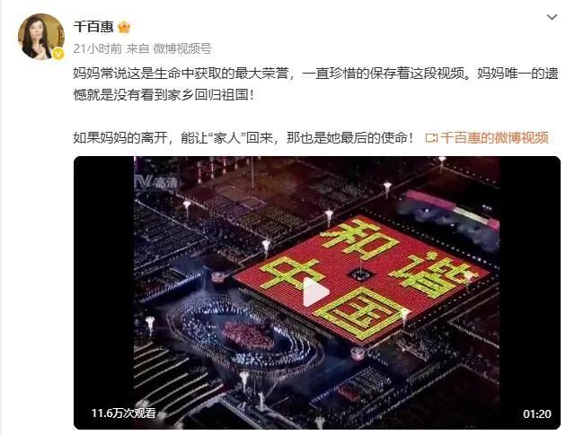 文中称,千百惠一直珍惜的保存着这段视频:妈妈唯一的遗憾就是没有看到家乡回归。