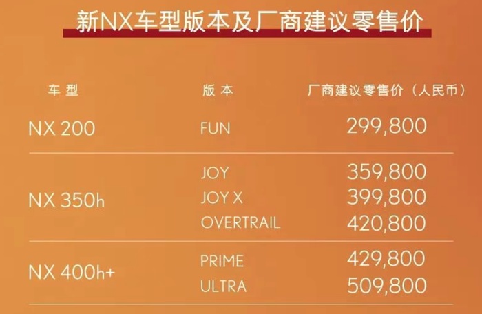 据介绍,雷克萨斯新NX采用新命名体系,提供六款车型配置,涵盖纯燃油(NX200)、油电混动(NX350h)及插电混动(NX400h+)三大动力选择。