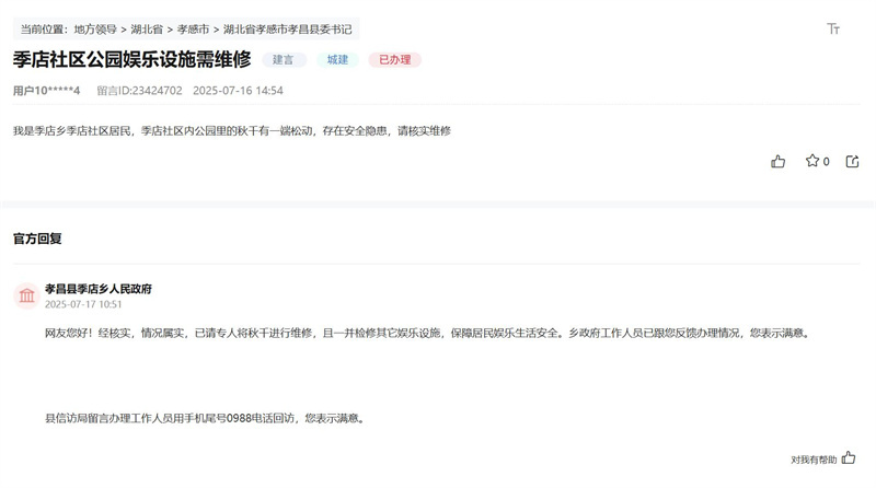 “社区公园的秋千有一端松动,存在安全隐患,请核实维修。”7月16日,孝昌县季店乡季店社区居民留言反映安全隐患。