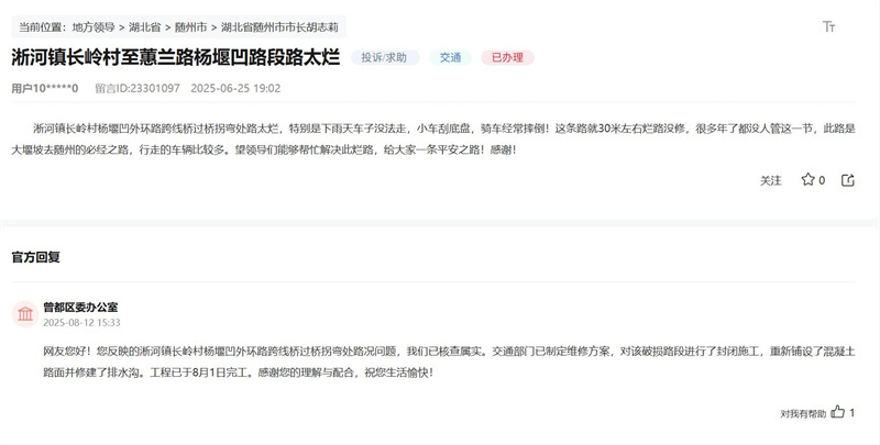 人民网武汉8月23日电 (记者张隽)近日,湖北网民通过人民网“领导留言板”反映身边急难愁盼,涉及安全设施、道路通行、公共娱乐等领域,相关部门快速核查、高效处置,将“民生小事”办实办好,获得网民认可。