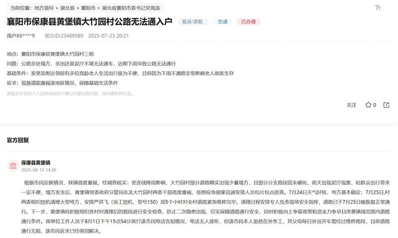 “公路多处塌方,泥泞不堪无法通车,高龄老人出行极为不便!”7月23日,襄阳市保康县黄堡镇大竹园村村民留言求助。