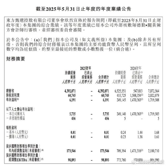 8月22日,东方甄选公布截至2025年5月31日的2025财年综合业绩,财报显示,2025财年,东方甄选持续经营业务(即自营产品及直播电商业务)净营收由65亿元同比减少32.7%至44亿元,持续经营业务净溢利实现扭亏为盈,2025财年上半年的净亏损9650万元。