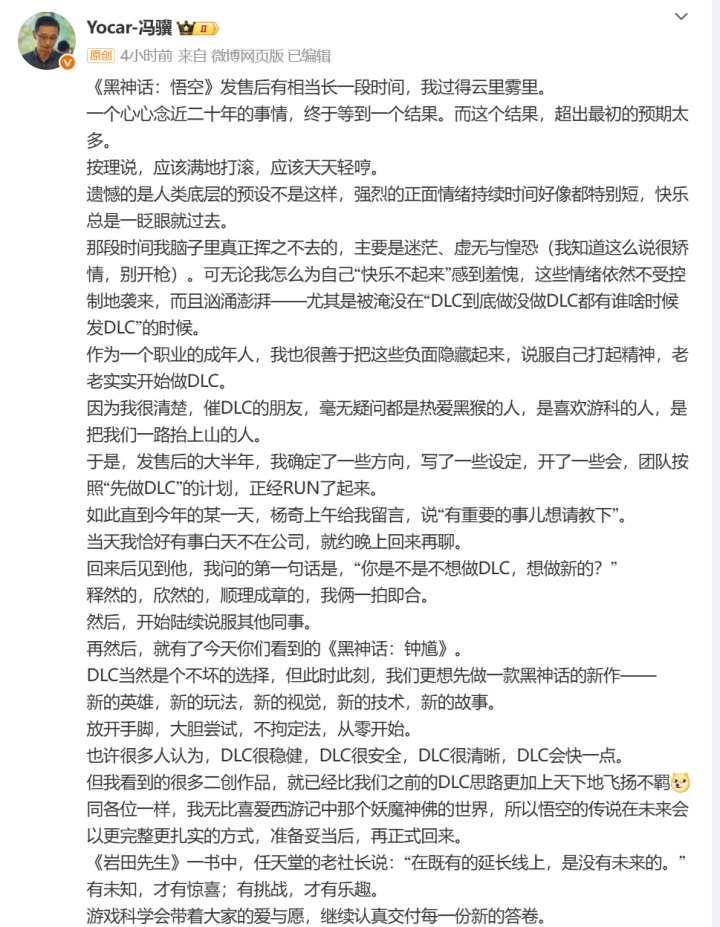 8月20日凌晨,游戏科学创始人、CEO,《黑神话:悟空》制作人冯骥发文解释为何推出新作。他表示,《黑神话:悟空》发售后有相当长一段时间,他过得云里雾里。DLC当然是个不坏的选择,但此时此刻,他们更想先做一款黑神话的新作——新的英雄,新的玩法,新的视觉,新的技术,新的故事。他补充说,“悟空的传说在未来会以更完整更扎实的方式,准备妥当后,再正式回来。”