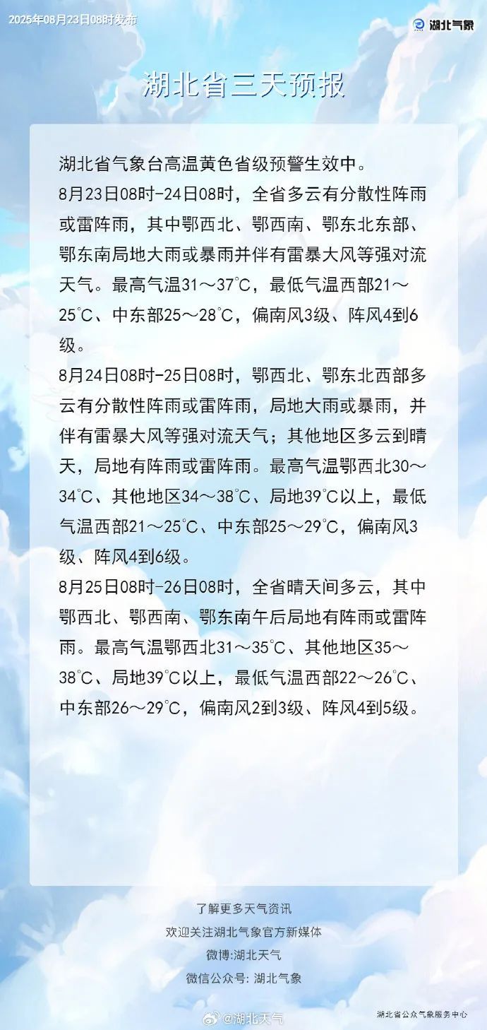 提醒公众未来三天需继续做好防暑降温工作,及时补水,避免高温时段长时间户外活动,谨防中暑。本周末鄂西地区及东部多地有降雨和强对流天气,建议公众及时关注最新预警、预报信息,外出注意防雷避雨。