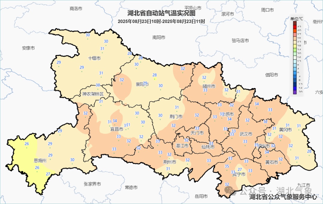 今日,湖北省高温黄色省级预警生效中。上午11时,鄂西北大部和恩施气温为27~29℃,其他地区为30~34℃,鄂州最高34.8℃,气温还在持续上升中......