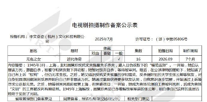 其中包括,《无名之女》电视剧拍摄制作备案公示表。该剧以主妇周慧珍反抗丈夫施暴失手杀夫为内容主线。