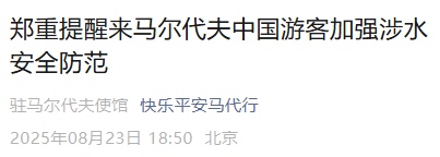 8月23日,中国驻马尔代夫大使馆微信公众号发布《郑重提醒来马尔代夫中国游客加强涉水安全防范》,全文如下:
