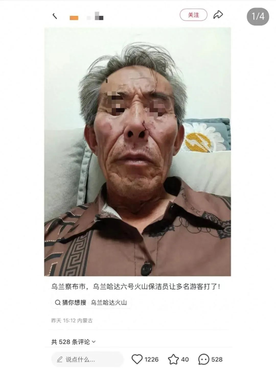 社交媒体上,多名游客反映称,在火山景区游玩时,目击一保洁员遭游客殴打。有游客发帖描述:“事发地为乌兰哈达6号火山,一名保洁员劝阻游客不要乱扔烟雾棒,要求将废弃烟雾棒扔进垃圾桶时,遭到多名游客用烟雾棒殴打,导致身上出现多处伤痕。”
