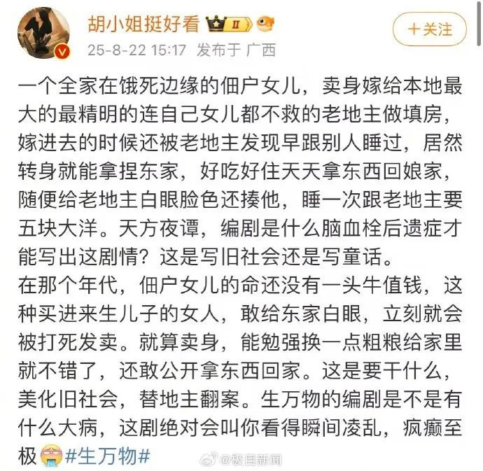 有关《生万物》剧情“不符合历史真实”的讨论近一周来比比皆是。“胡小姐很好看”提到,在那个年代,佃户女儿的命还没有一头牛值钱,“这种买进来生儿子的女人,敢给东家白眼,立刻就会被打死发卖。”