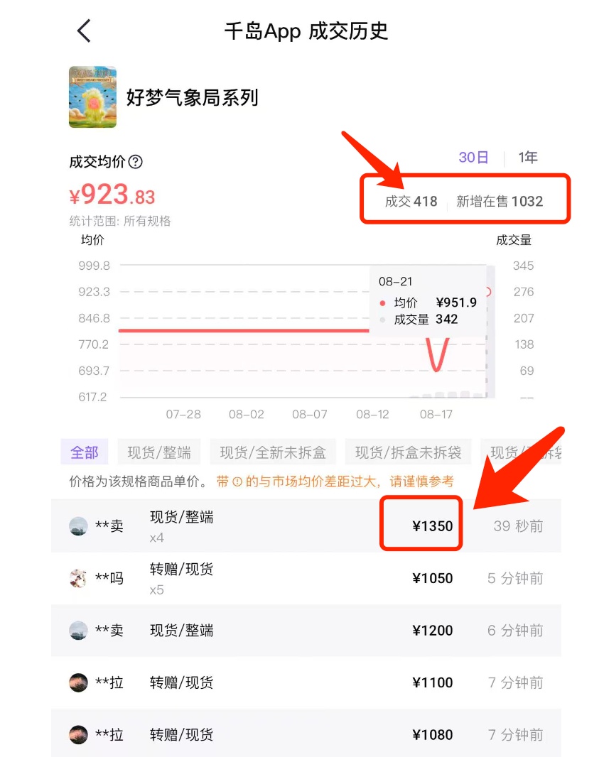 例如在千岛APP上,星星人今日最新整盒成交价达到1350元,溢价约3倍,单个平均价约150元,溢价约2倍,隐藏款价格高达478元,溢价更是超过6倍。有人直呼“这么贵到底是谁在买”“简直比黄金还离谱”。
