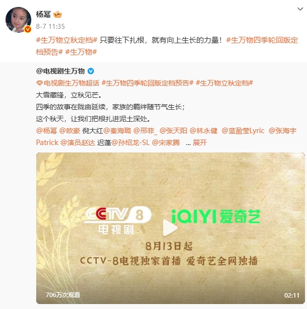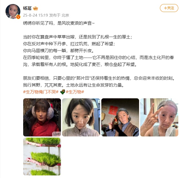 电视剧《生万物》正式收官。8月24日,杨幂发文告别《生万物》和“绣绣”: