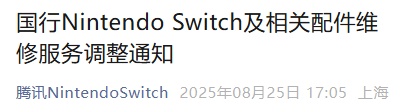 8月25日,据腾讯NintendoSwitch公众号发布文章,国行Nintendo Switch将于2026年12月31日停止Nintendo Switch游戏机、Nintendo Switch游戏机(OLED版)及相关配件的维修服务。