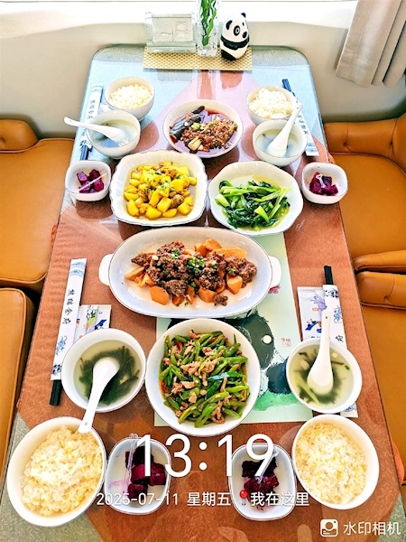 记者进一步向工作人员了解到,“熊猫专列·安逸号”为旅客提供全程餐饮服务,包括列车餐和落地餐。其中,列车餐分为列车盒餐与列车桌餐两种形式,除最低档位的“熊猫归阁”房型外,其他房型旅客均可享受列车桌餐服务。工作人员还提供了实际列车桌餐的照片,显示通常为五菜一汤加一份水果。