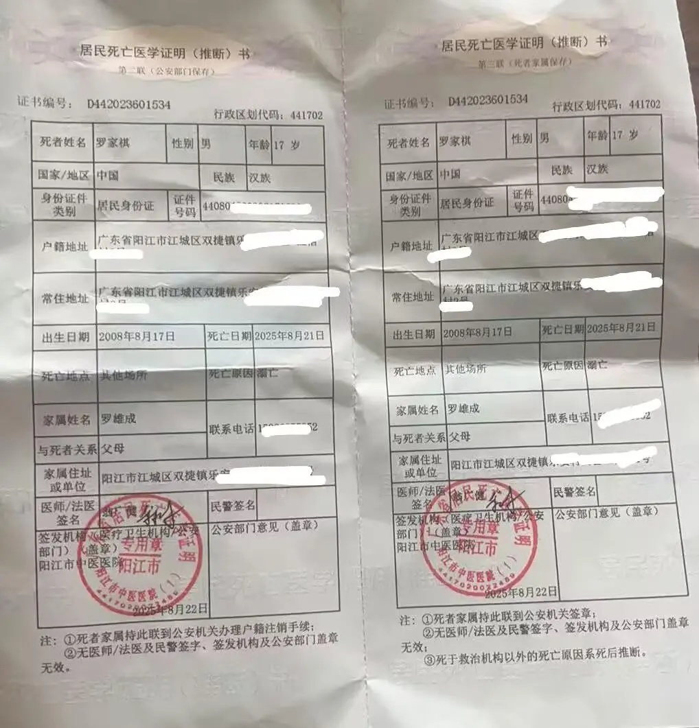 死亡证明显示罗家祺为溺亡