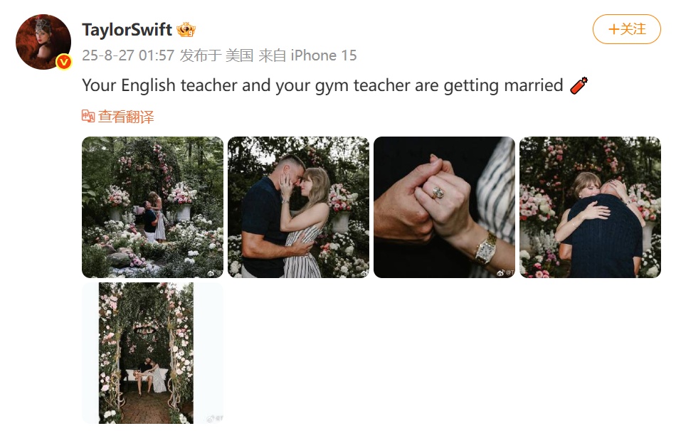 北京时间8月27日,泰勒·斯威夫特(Taylor Swift)与男友NFL球星特拉维斯(Travis Kelce)宣布订婚。贴文配文写道:“你的英文老师和体育老师要结婚了”。