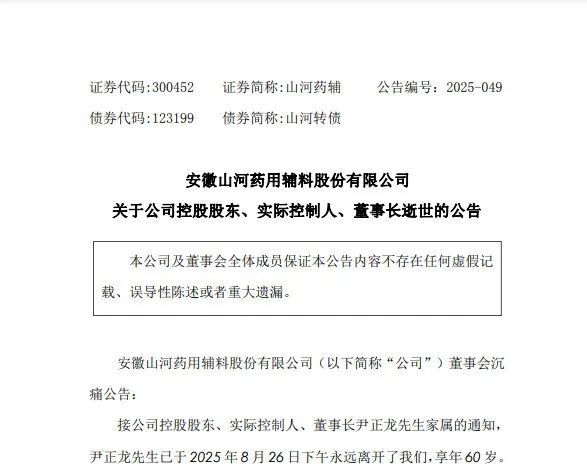8月27日早间,山河药辅发布公告称,公司控股股东、实际控制人、董事长尹正龙于2025年8月26日下午逝世,享年60岁。