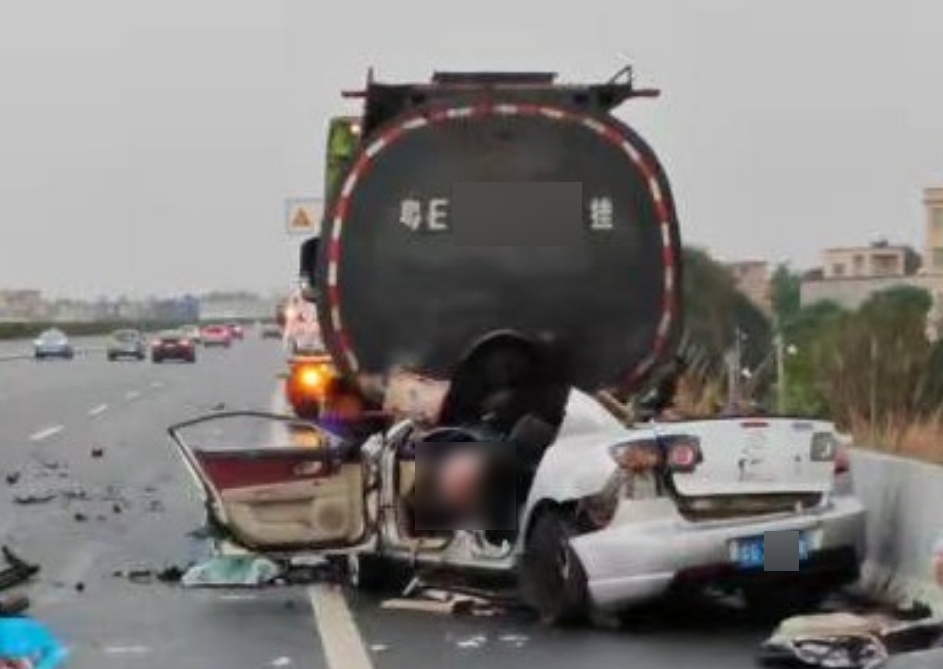 4时51分许,黄某杏驾驶、从广东佛山市前往湛江市、装载沥青的粤E3***9号重型半挂牵引车(牵引粤EF***挂)经过事故地点时,车身右侧碰撞停在第四车道内的粤L8***B号小型轿车后停在应急车道上,造成两车损坏。