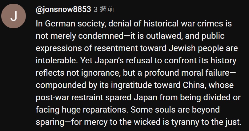 海外网友@jonsnow8853表示:“在德国,否认历史战争罪行不仅会受到谴责,还是被禁止的,公开表达对犹太人的怨恨更是无法容忍。然而日本拒绝正视历史,反映的并非无知,而是深刻的道德沦丧。”该网友还称:“对恶人的怜悯就是对正义者的暴政。”