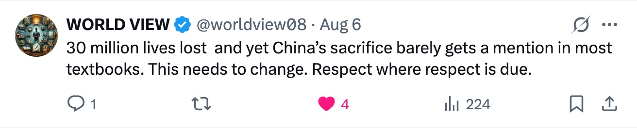 海外网友@worldview08评论道:“三千万人伤亡,然而中国的牺牲在大多数教科书中几乎没有提及。这需要改变。应该给予充分尊重。”