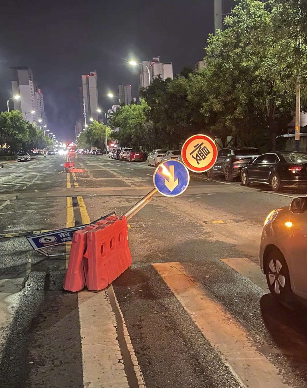 8月25日,倾盆大雨之后,襄阳高新区汉江北路一处施工路段的“减速慢行”及通行方向指示牌倾斜,倾斜的标志牌占据半个车道。