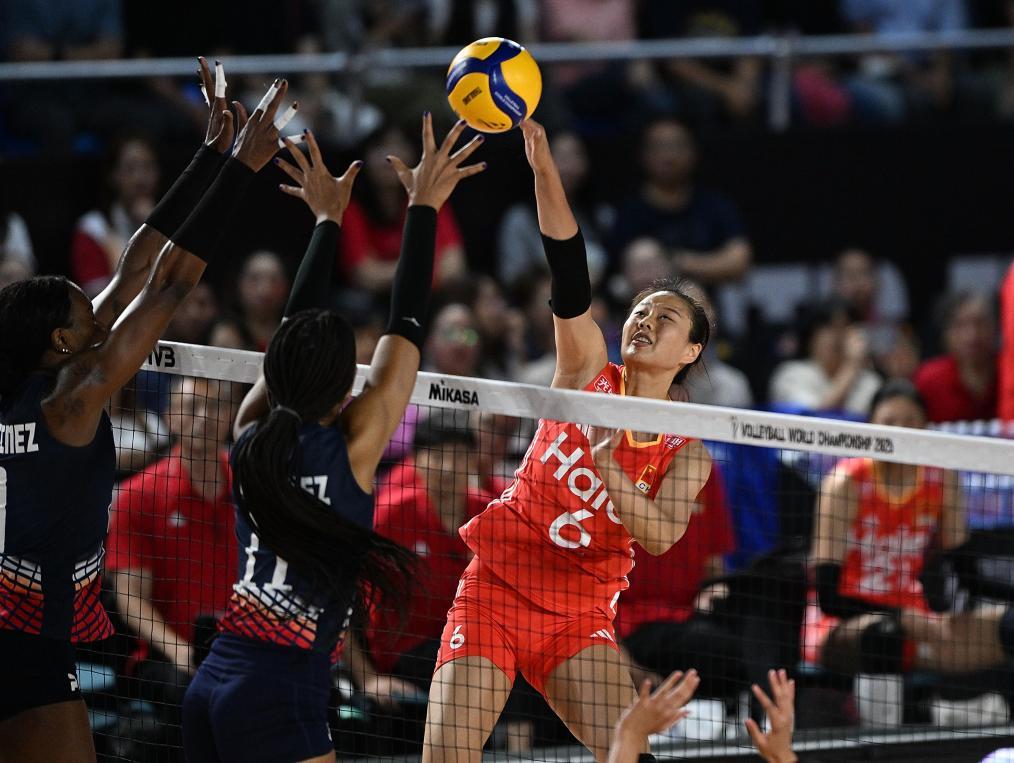 8月27日,中国队球员吴梦洁(上)在比赛中扣球。新华社记者 侯昭康 摄