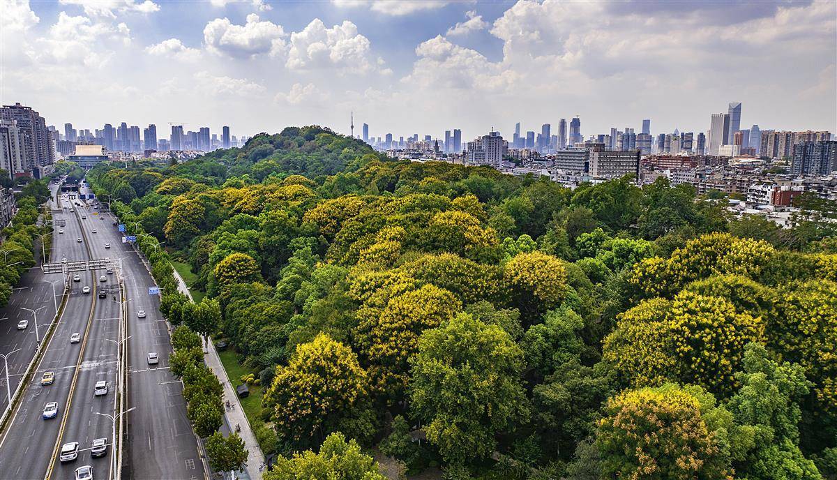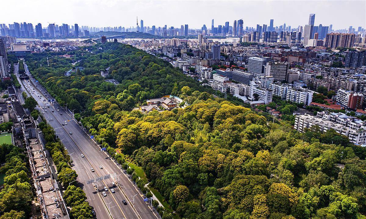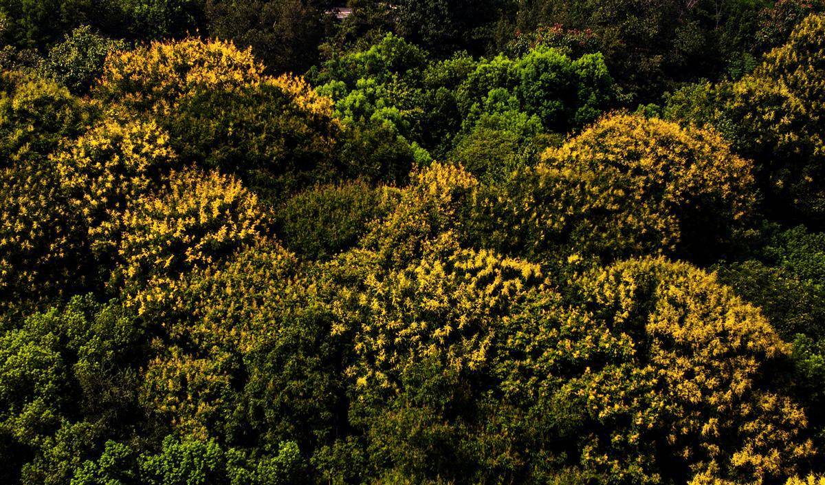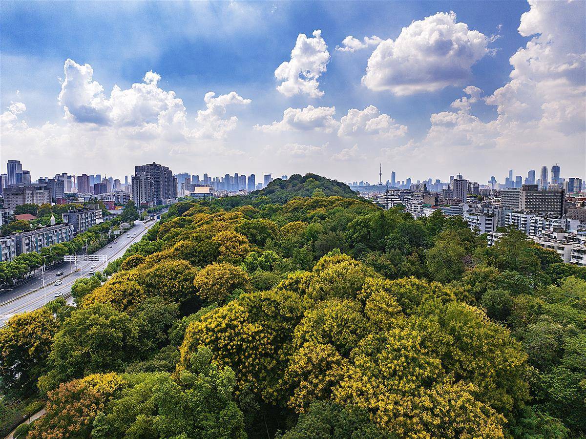 8月27日,鸟瞰武汉蛇山漫山遍野的栾树花,当日江城不但有蓝天白云,更有金黄的栾树花。树上挂满金黄,树下黄花一地。