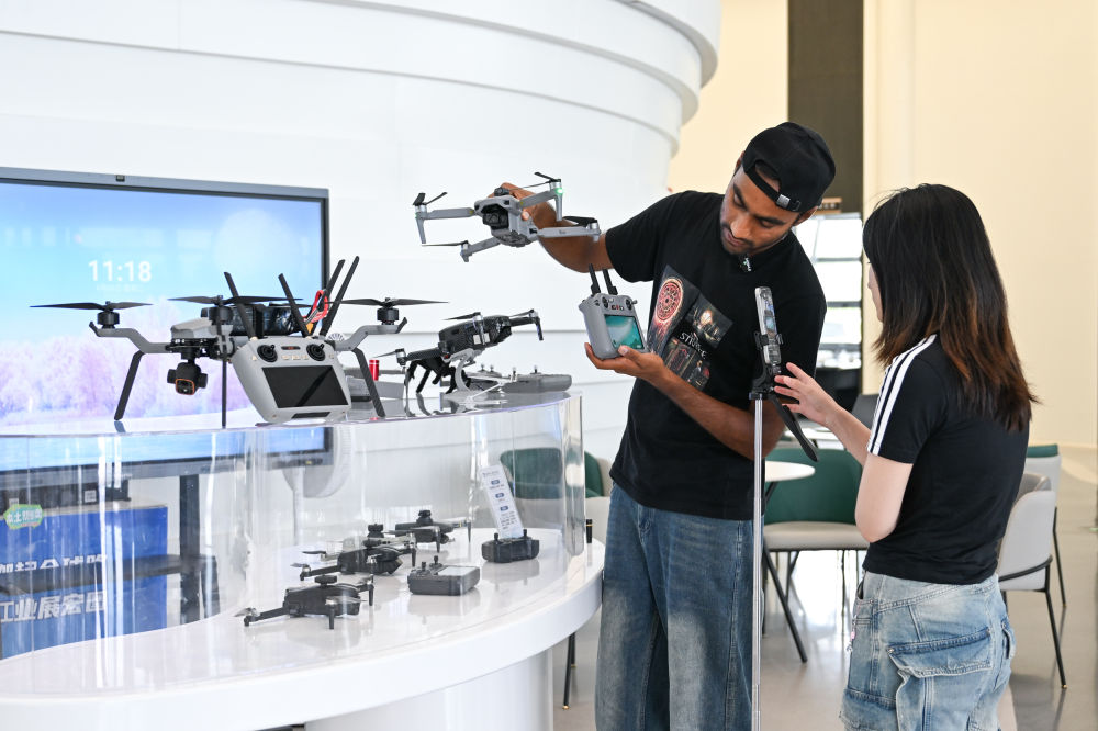 8月26日,在湖北省鄂州市跨境电商产业园,主播在直播售卖无人机相关产品。记者杜子璇 摄