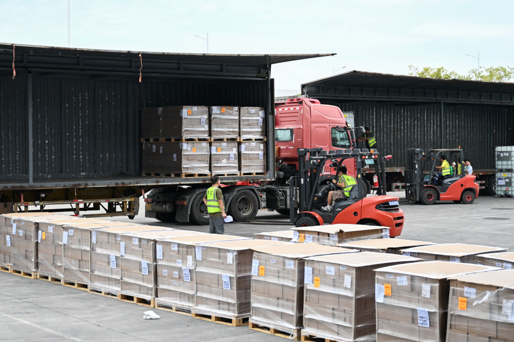 8月26日,在湖北鄂州花湖国际机场,工人在搬运货物。记者杜子璇 摄