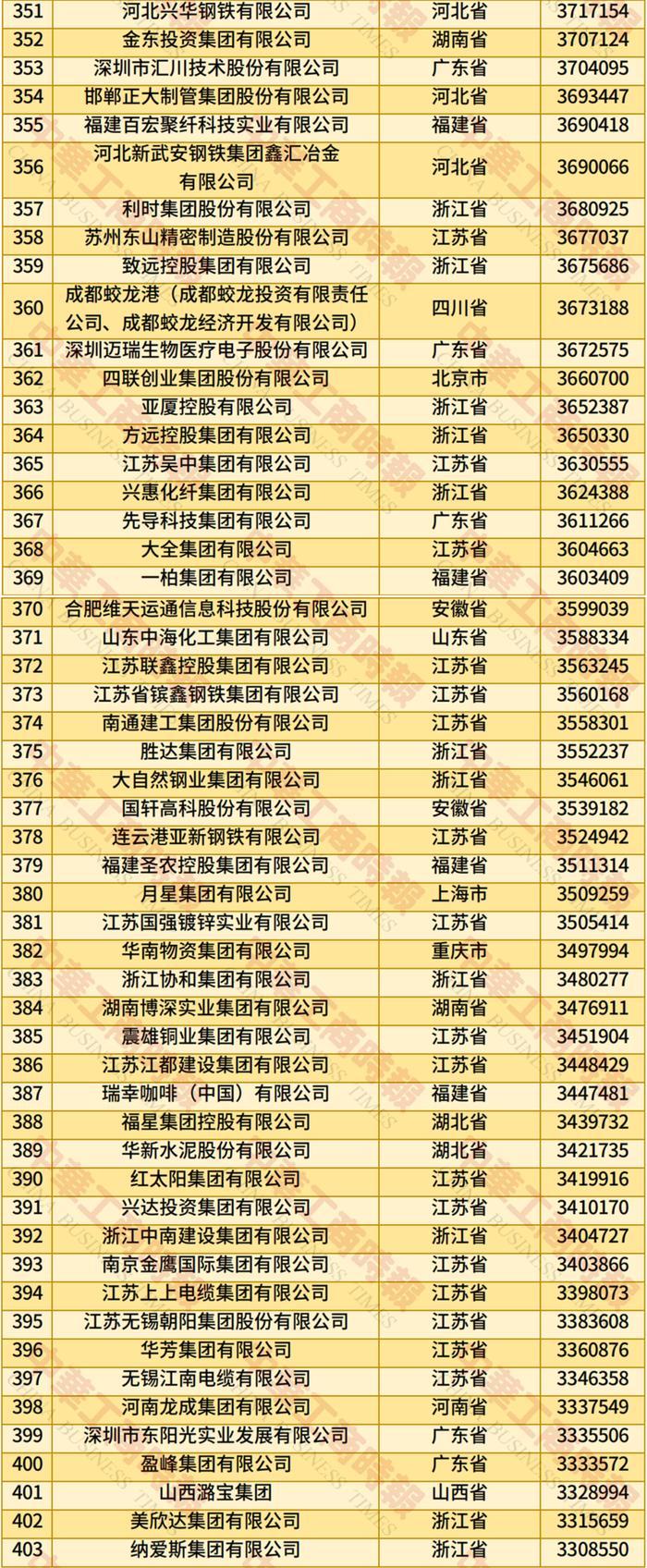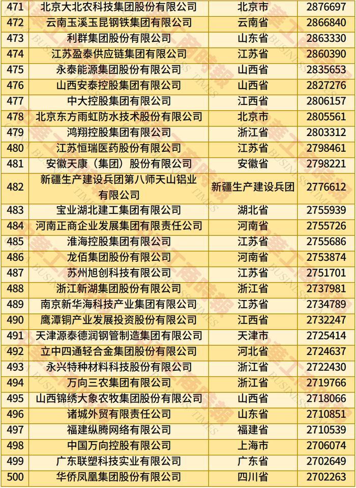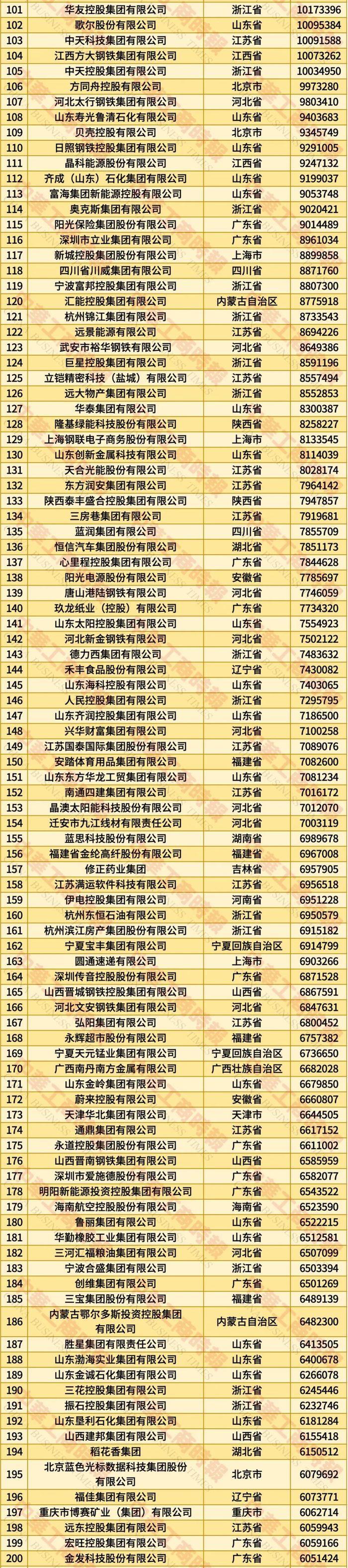 此外,榜单前十的民营企业还有腾讯、浙江荣盛控股、浙江吉利控股、盛虹控股、山东魏桥创业集团。榜单前十企业营收总额的门槛为5585亿元。