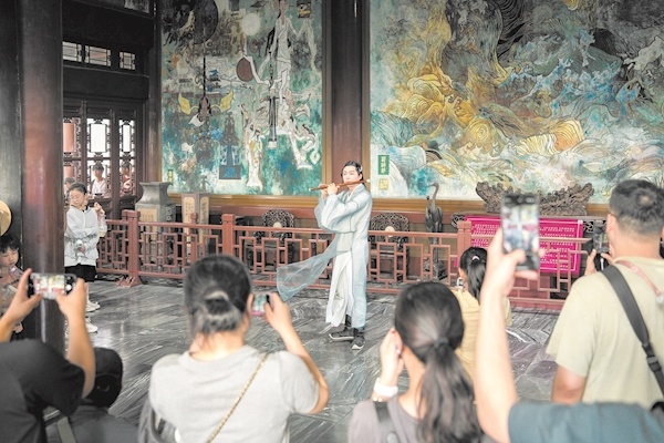 8月29日,黄鹤楼的游客们有了新体验——《黄鹤楼中吹玉笛》演出常态化。该演出以李白《与史郎中钦听黄鹤楼上吹笛》为蓝本,身着精致古装服饰的演员们,或扮作文人墨客,或化身宫廷乐师,以快闪形式与游客“偶遇”,让游客在登楼过程中,感受到“诗、笛、楼”的绝美意境。 楚天都市报极目新闻记者冯袁玥 通讯员江楼摄影报道
