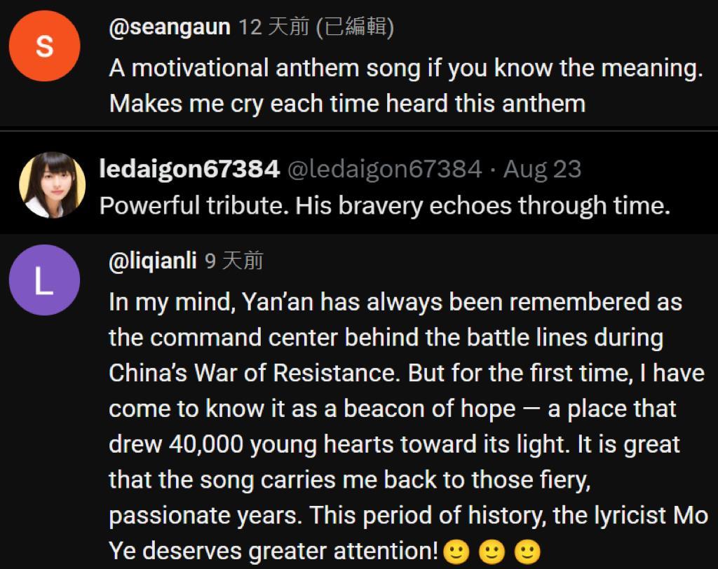 系列视频在CGTN官网、脸书、X、油管、B站、微信视频号等多个平台发布,收获海内外网友一致好评。许多网友被歌曲中传唱的革命精神触动。在海外平台,网友@seangaun表示:“《义勇军进行曲》是一首励志歌曲,每次听到它我都会哭。”网友@ledaigon67384被王二小的牺牲感动:“王二小的英勇事迹永载史册。”网友@liqianli表示:“我第一次意识到延安是一座希望的灯塔,吸引四万颗年轻的心走向光明。这段历史和词作者莫耶值得更多关注!”