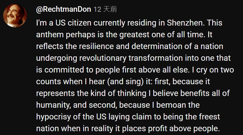 不少网友以史为鉴,反思当前国际形势。网友@RechtmanDon表示:“《义勇军进行曲》体现了一个国家在经历革命性变革、致力于以人为本的韧性和决心。”该网友还表示:“首先,这首歌代表了我认为有益于全人类的思维方式;其次,我痛恨美国自诩最自由的国家,实际却将利益置于人民之上。”