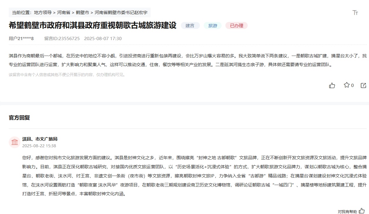 河南拥有丰富的文化旅游资源,近日,河南多地网民通过人民网“领导留言板”留言,列出当地旅游发展的“问题清单”,给出文旅发展的“金点子”,从洛阳的“东方博物馆之都”建设到淇县的“封神文化”挖掘,从辉县的山水旅游开发到内黄的特色农业旅游,河南各地正不断创新文旅融合发展模式,提升服务质量。