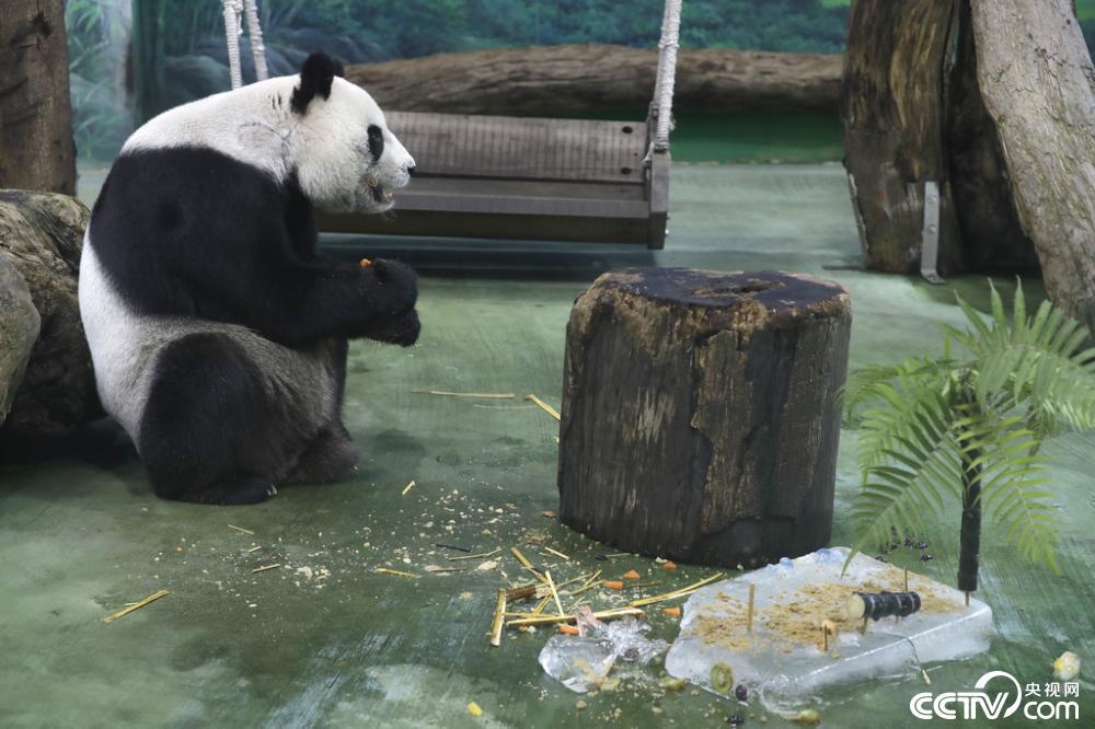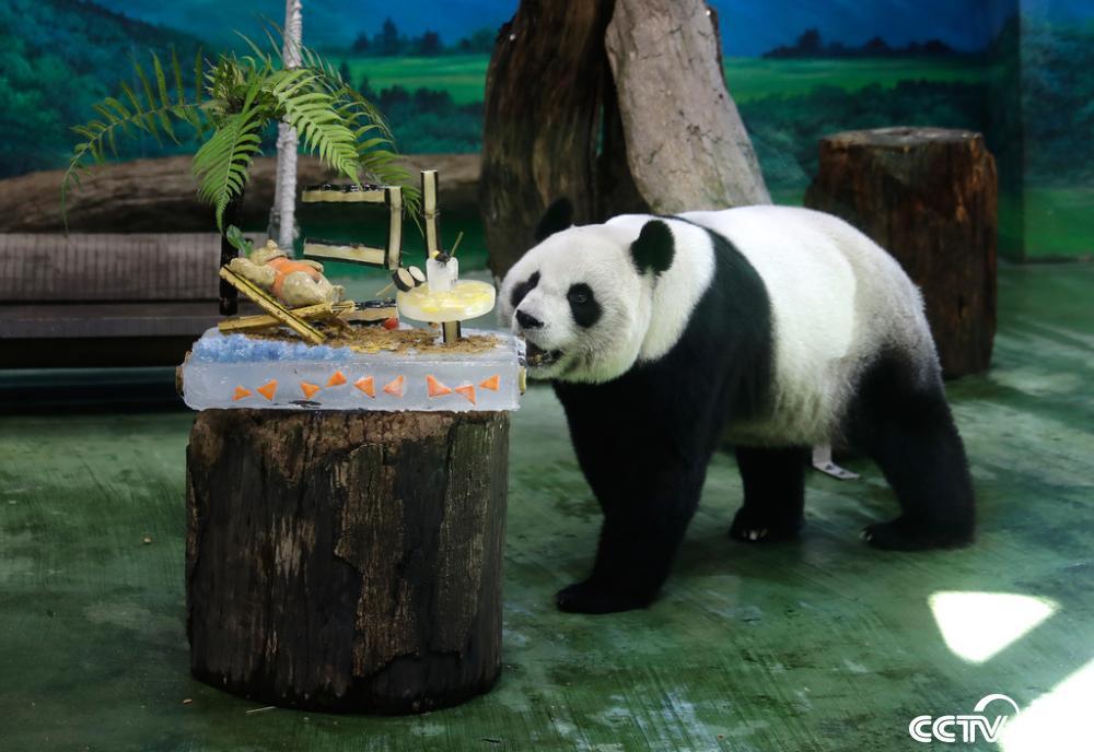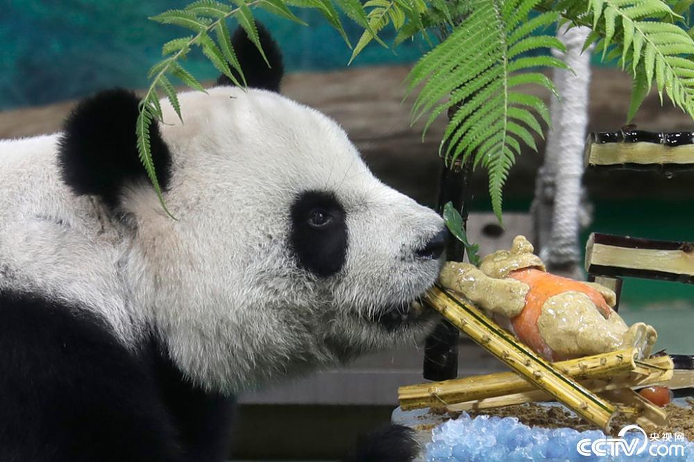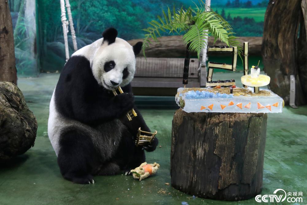 8月30日,台湾台北动物园,大熊猫“圆圆”享用生日蛋糕,庆祝21岁生日。 视觉中国