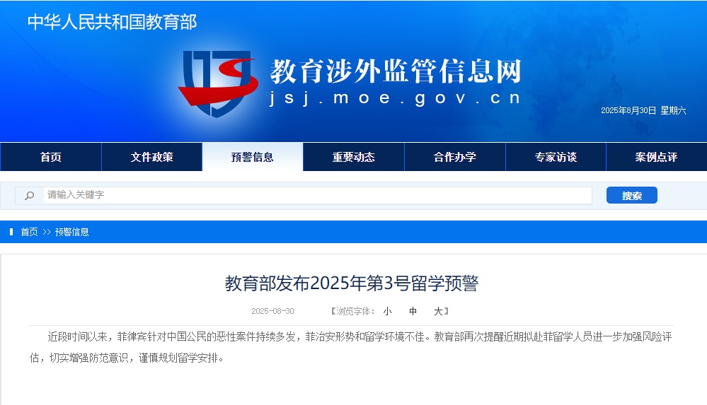近段时间以来,菲律宾针对中国公民的恶性案件持续多发,菲治安形势和留学环境不佳。教育部再次提醒近期拟赴菲留学人员进一步加强风险评估,切实增强防范意识,谨慎规划留学安排。
