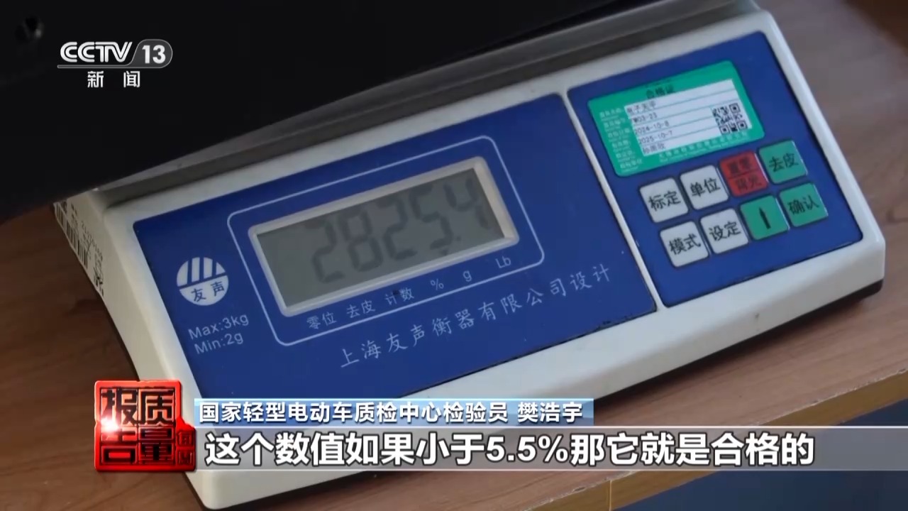 国家轻型电动车质检中心检验员 樊浩宇:做这个项目,主要是要把车上所有塑料给拆下来,然后称重它的整个质量,通过计算我们就可以得到塑料的总质量在整车当中的占比,这个数值如果小于5.5%,那它就是合格的。