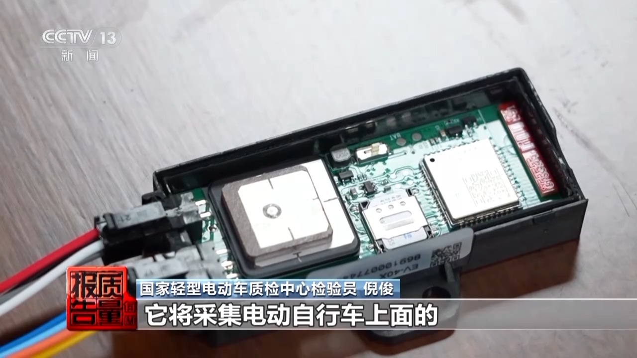 国家轻型电动车质检中心检验员 倪俊:这个就是车上的中控,它里面包含了北斗和通信模块,它将采集电动自行车上面的电池、电压、电流信息,包括车速和定位信息,然后通过4G通信模块发送至企业平台,供企业和用户查看。