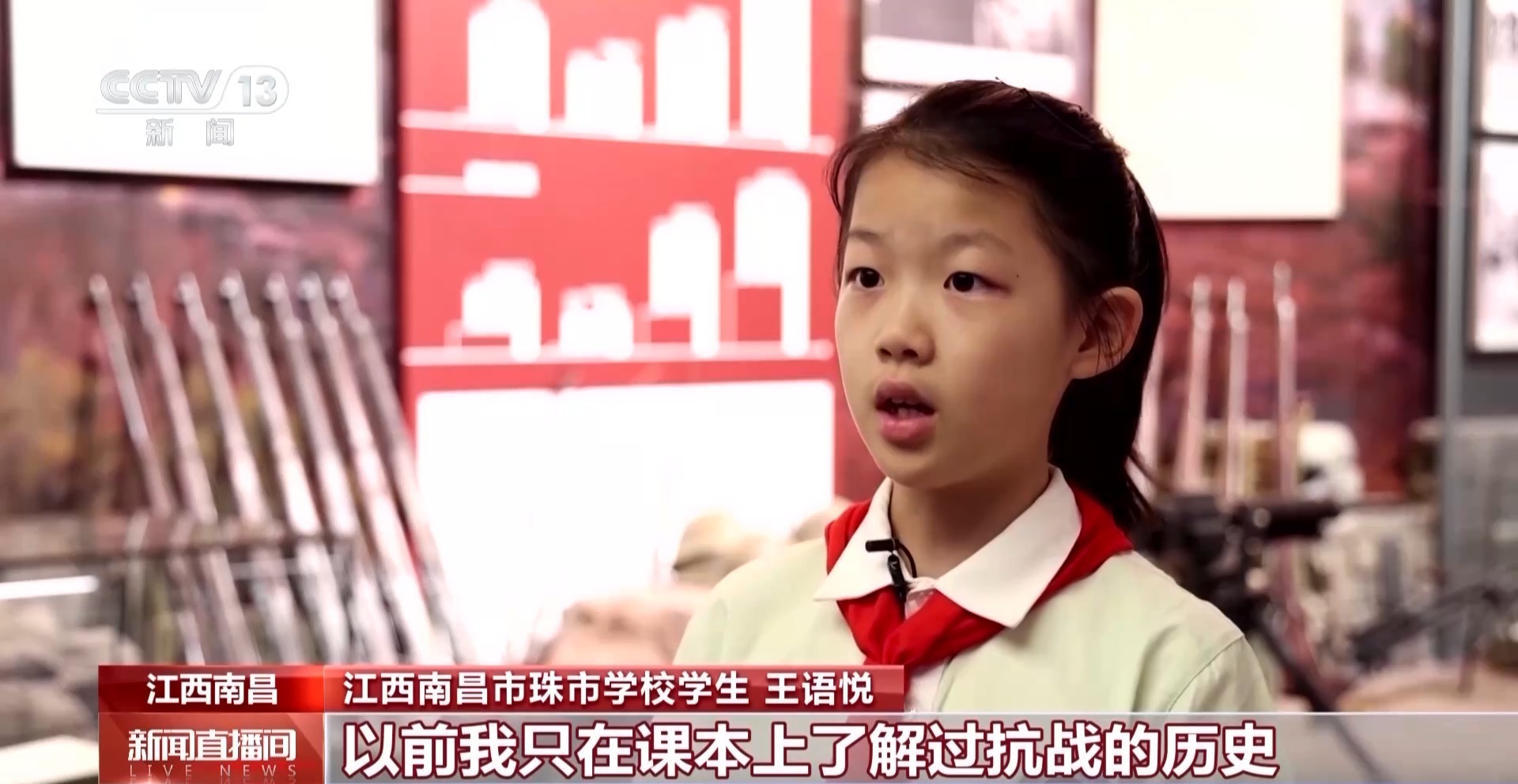 江西南昌市珠市学校学生 王语悦:以前我只在课本上了解过抗战的历史,今天看着战士们用过的旧水壶、旧手枪,听着过去的故事,感受到胜利是多么来之不易,我们要珍惜现在的幸福生活。