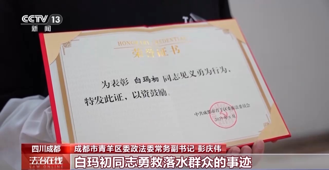 成都市青羊区委政法委常务副书记 彭庆伟:白玛初同志勇救落水群众的事迹,展现了中华民族的优良传统美德和当代青年的良好精神面貌,传递了社会正能量。青羊区委政法委按照省区市相关政策法规,第一时间启动了见义勇为认定程序,并报请区政府认定了白玛初同志英勇救人的见义勇为行为。