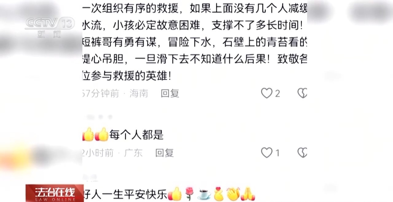 此时,上游的人们也用身体形成了一道人墙阻挡了湍急水流,在他们的帮助下,肖锋最终成功把男孩抱了出来。