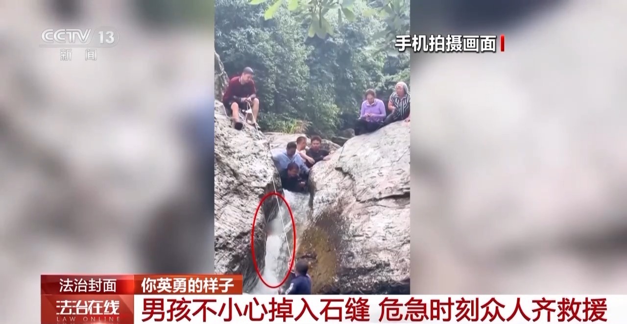 男孩不小心掉入石缝 危急时刻众人齐救援