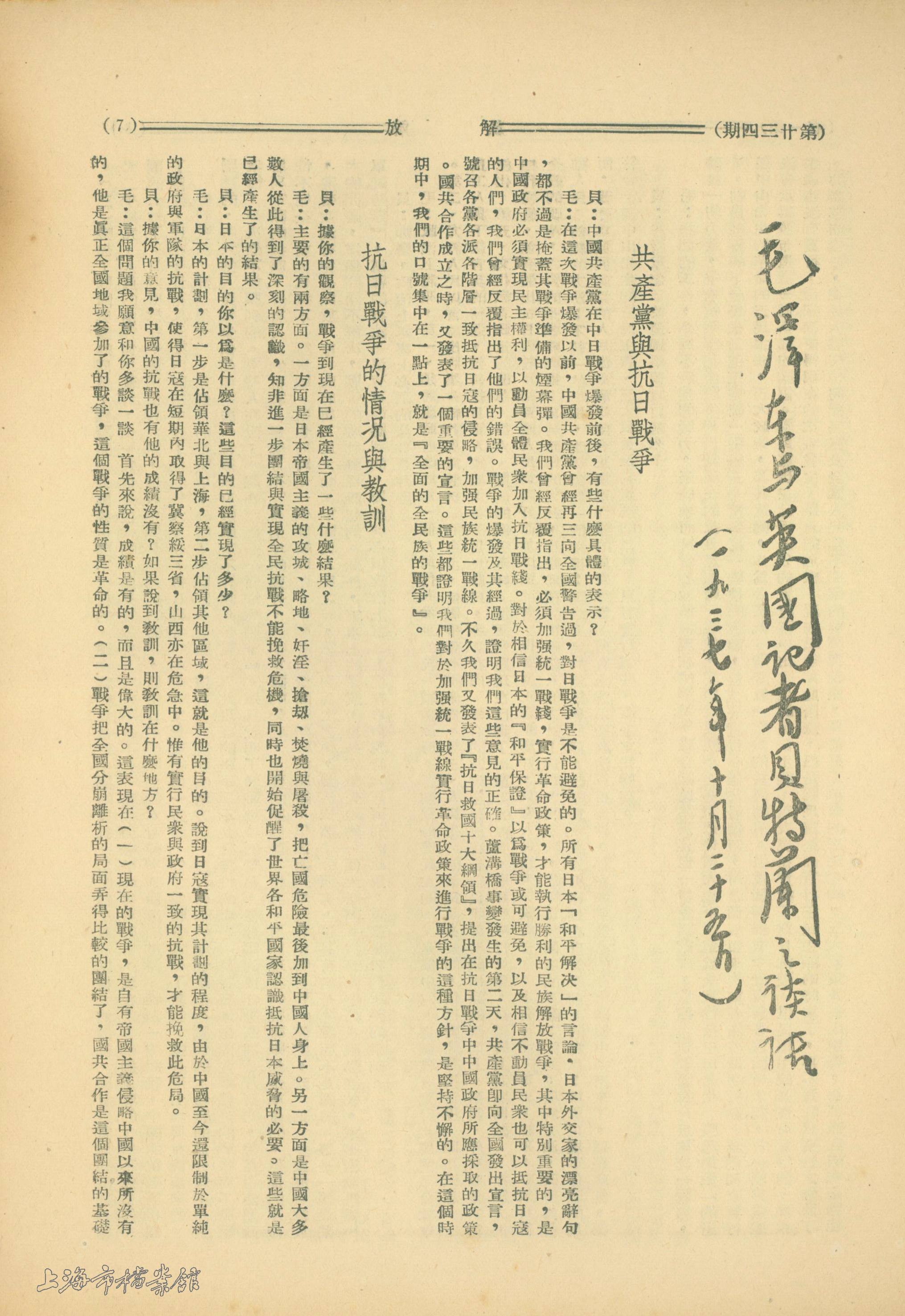 1937年10月25日,《毛泽东与英国记者贝特兰之谈话》。(上海市档案馆藏)