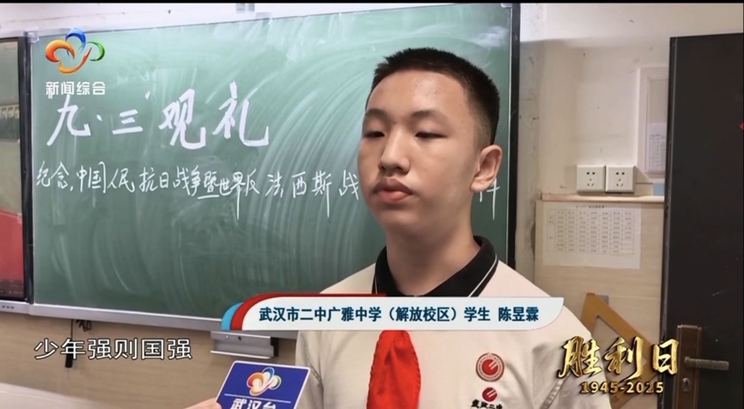 武汉广播电视台新闻综合频道《民生e线》栏目推出60分钟特别节目《胜利日》,从纪念、回望、见证、传承四个方面,通过抗战老兵、英烈后代、爱国人士口述历史,时空对话,文物见证等形式,唤起家国记忆,点燃爱国热情,传承伟大抗战精神。