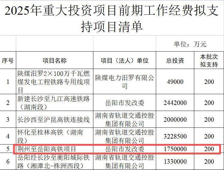 其中,荆州至岳阳高铁项目负责单位为岳阳市发改委,总投资175亿元,此次拟支持前期工作经费200万元。