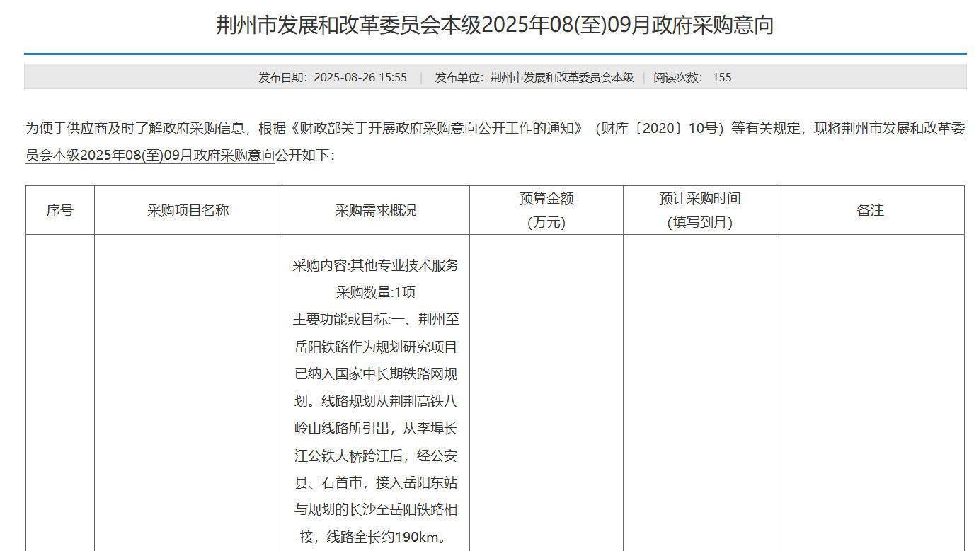 与此同时,在荆州市发改委近期发布的2025年8月至9月政府采购意向中,也将荆州至岳阳铁路的前期研究纳入采购名单。